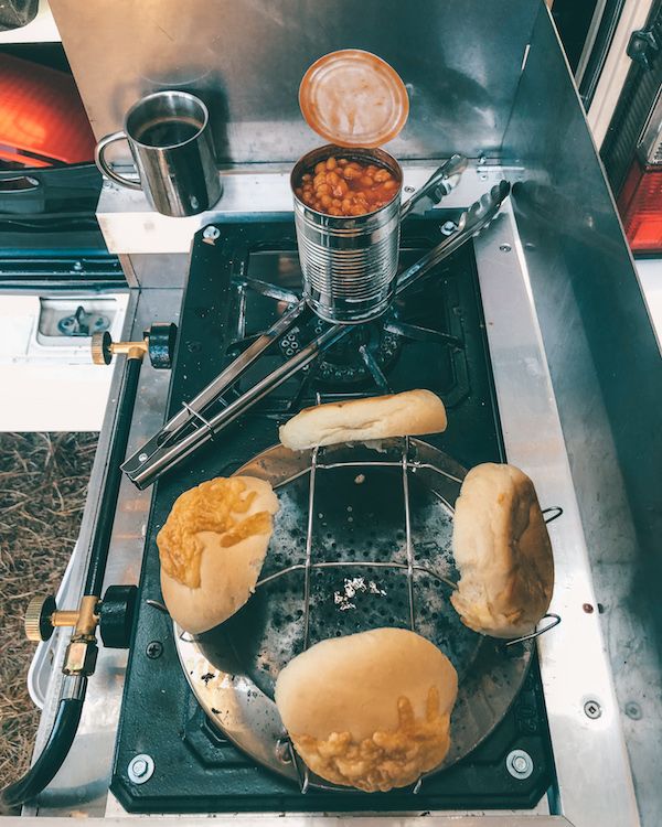 One of the most affordable breakfasts has to be beans on toast. This is just so simple to make and requires very little clean up. If you're careful you can heat the can of beans right on the burner (make sure to take off the label first). Our handy toasting apparatus was great for toasting buns to a perfect golden brown. This was our staple and we must have had it 6 or 8 times.