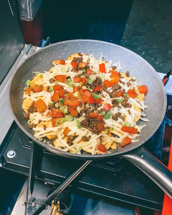Our dual burner LNG range was great with plenty of power to boil up water quickly. We also had a nice camping toaster aparatus that we ended up using every morning for our toasts. We had metal plates which came in handy to cover a frying pan and set up a makeshift oven. The LNG burners are too hot even at their lowest setting for making nachos so use a pair of tongs to raise the pan up a little.Let's get to it, our small mess, budget friendly, camping comfort food!
