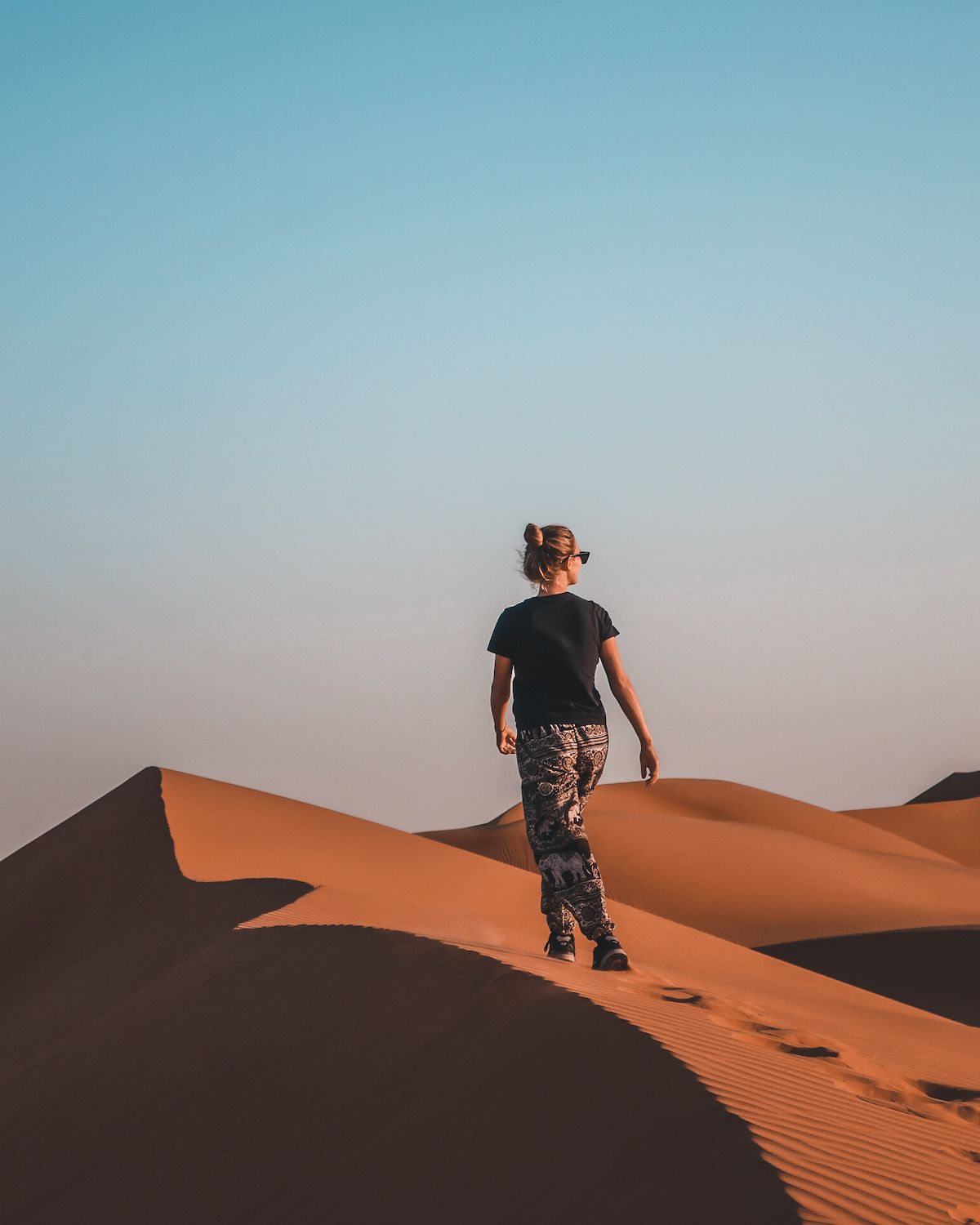 Back out into the dunes! We blasted music while driving fast down the sand road and found the camping spot our guide showed us. It had an expansive view of the area and there was surprisingly no wind. It started peacefully, but once the sun went down the winds got CRAZY! We planned to have a campfire, but our chairs almost blew away. We got so much sand in our eyes that we hid in our tent and watched the classic Aladdin Disney movie instead. The next morning we woke up with a layer of fine sand on our bodies.