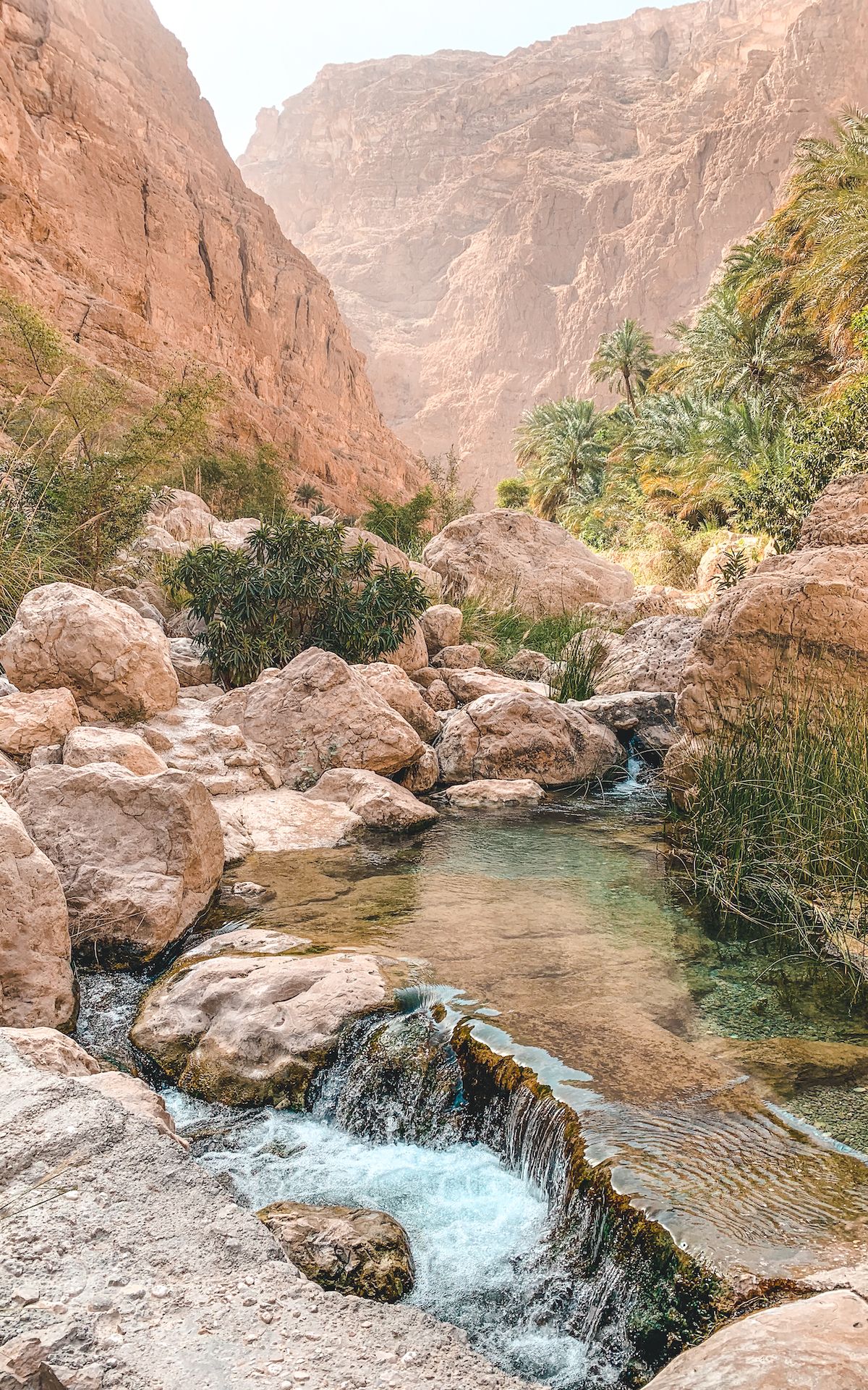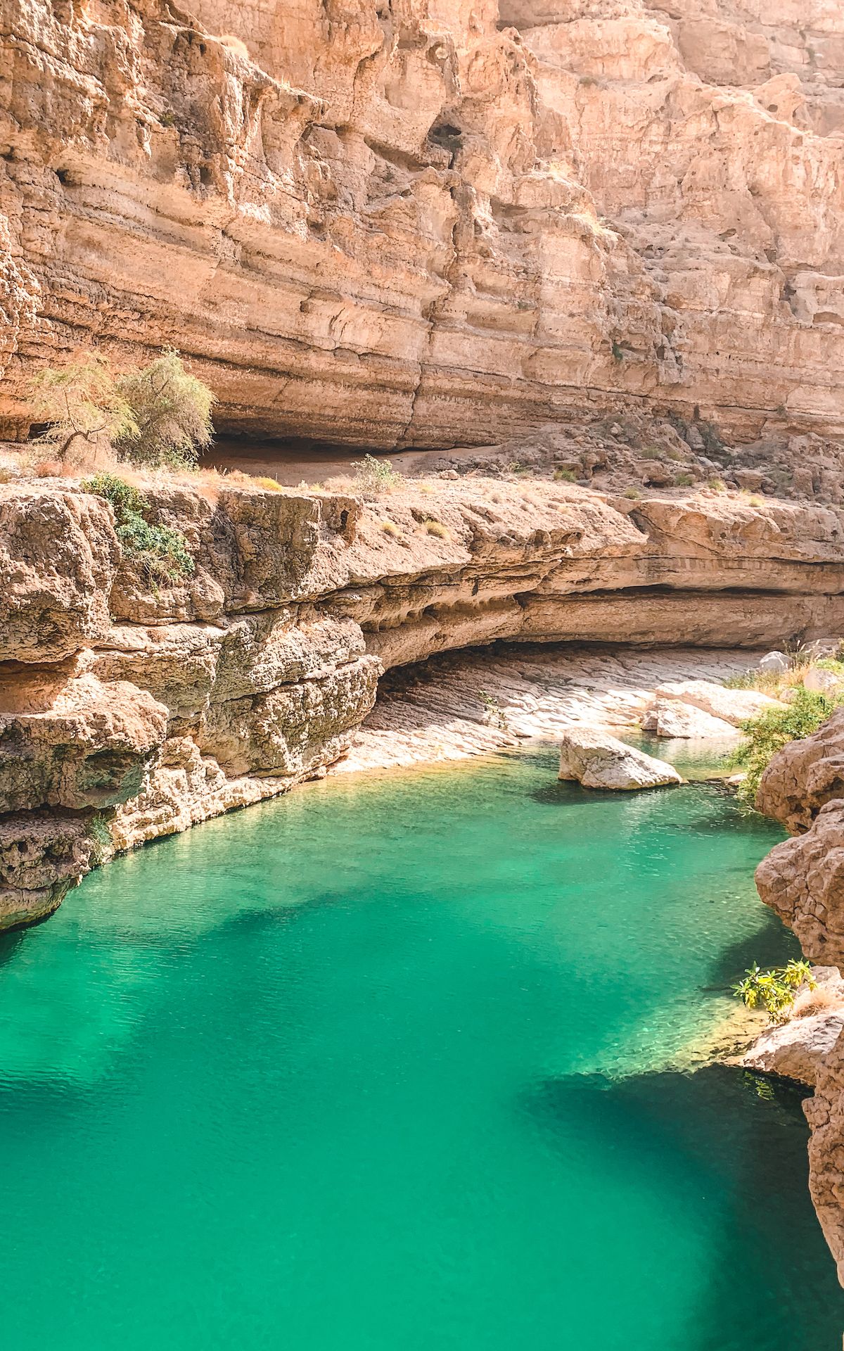 One of the best things to do in Oman is visit a wadi, an oasis in the desert where you can take a plunge into natural pools! At Wadi Shab, you take a 45-minute leisurely walk through a lush valley to reach the first of five consecutive pools. At the end of the fifth pool you will see a small crack in a cave that you can swim through revealing a beautiful hidden waterfall!