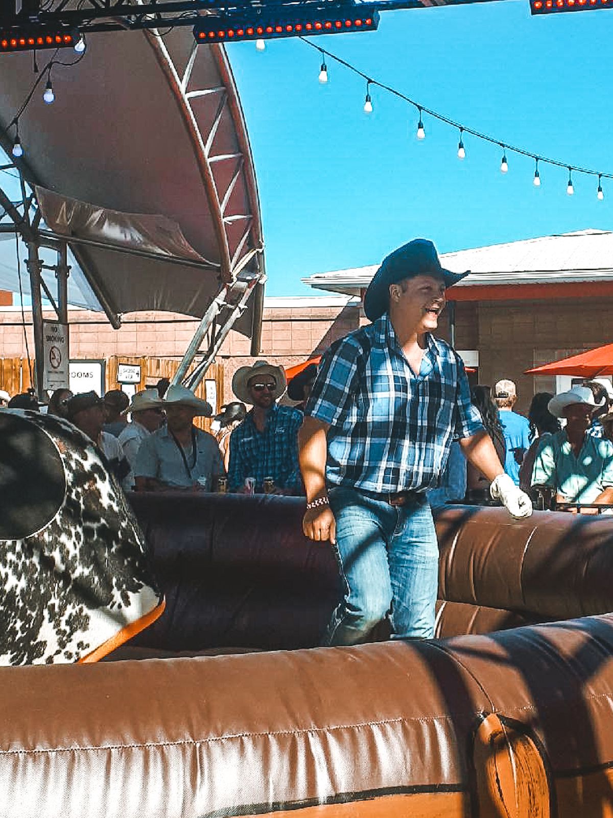 We avoided the heat by pre-purchasing rodeo tickets in the shade of the grandstand. The 500 and 700 sections are in the shade (we were section 511).