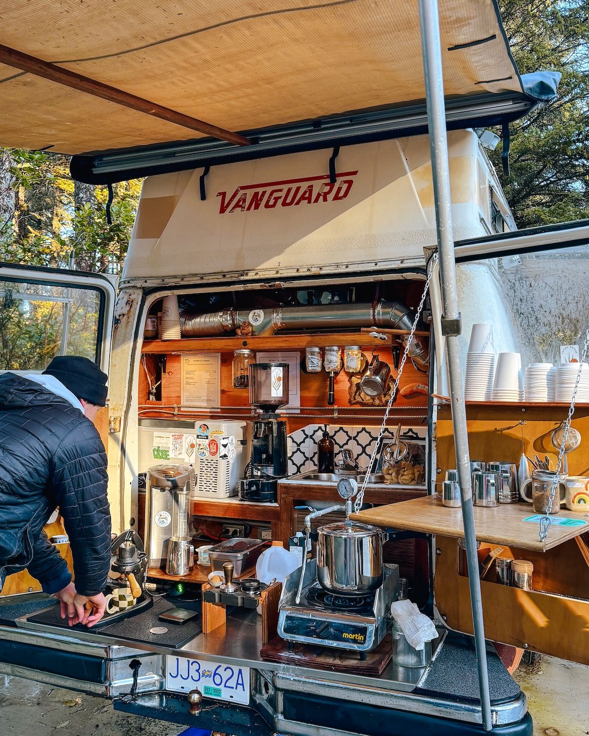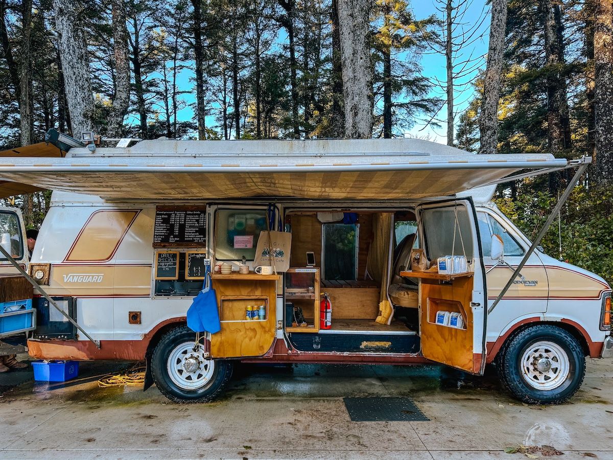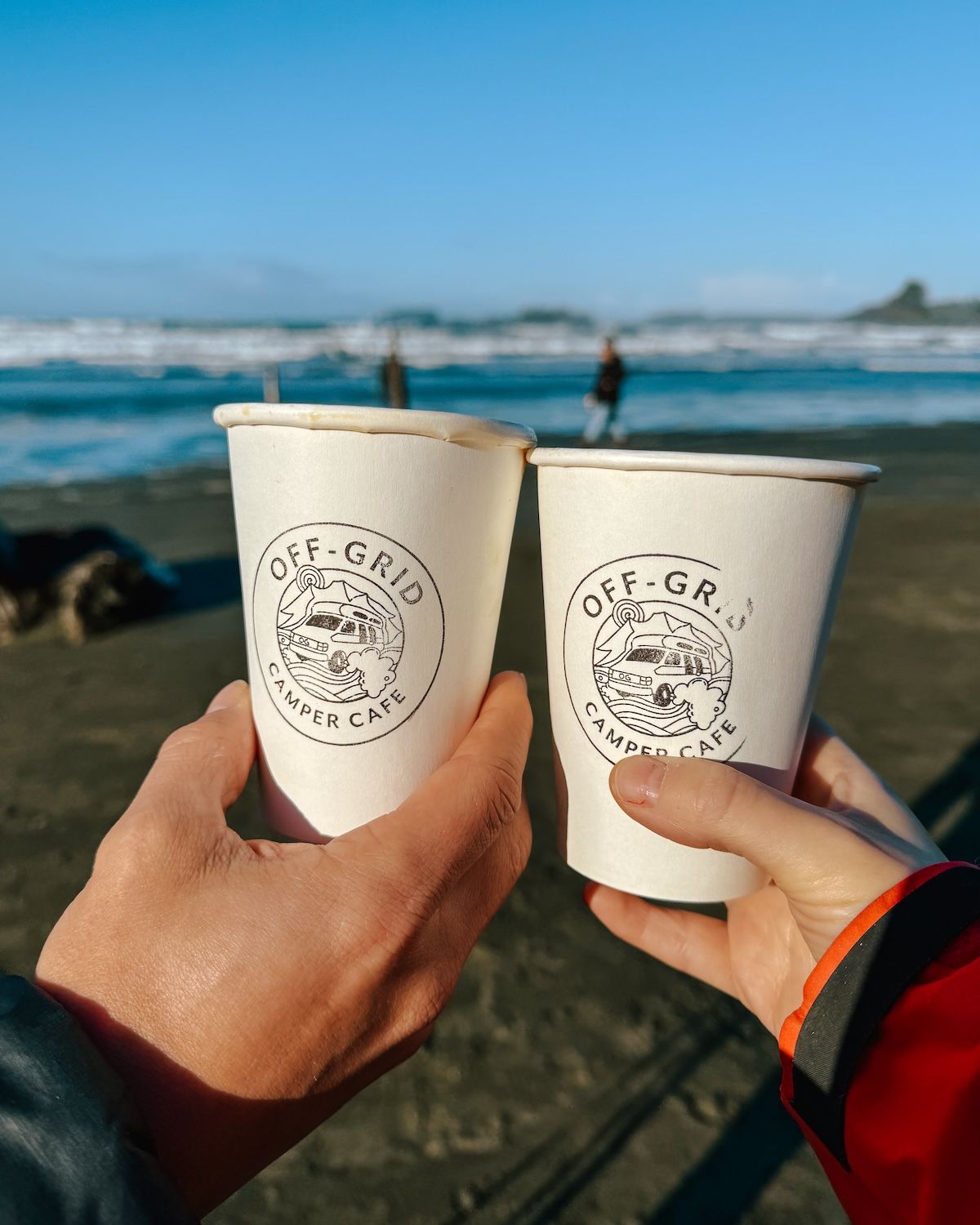 Grab coffee at Off-Grid Camper Cafe and take a morning walk along Cox Bay Beach